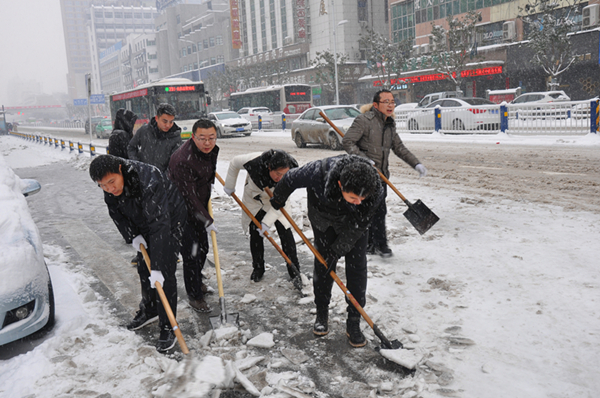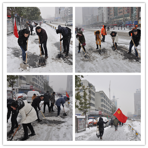 全體黨員在黨支部書記、區(qū)委組織部副部長李志的帶領(lǐng)下,不畏嚴(yán)寒,不顧風(fēng)雪,紛紛拿起鐵鍬,從北向南,沿人行道路,快速行動起來。希望通過清雪除冰行動,通暢道路,最大限度減輕大雪對附近居民和過往行人造成的不良影響。全體黨員一邊鏟雪,一邊還不忘叮囑過路的行人和車輛注意安全。一位過路的老大爺一邊豎起大拇指點贊,一邊不住的說:“謝謝你們,你們辛苦了”。關(guān)懷的話語,從心暖到全身。大家也不覺得累,整個除雪行動熱火朝天,經(jīng)過幾個小時的努力,一條100多米長的便捷的道路很快被清理出來。