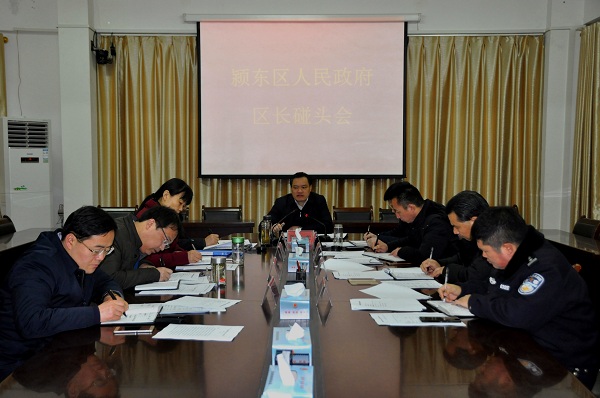 2月22日上午,春節(jié)假期后上班第一天,潁東區(qū)委副書記、區(qū)長張銀軍主持召開區(qū)長碰頭會,對當前有關(guān)重點工作進行安排和部署,區(qū)政府各副區(qū)長、黨組成員參加會議。