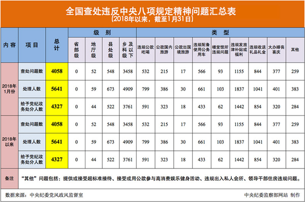 中央紀委監(jiān)察部網(wǎng)站22日發(fā)布消息,2018年以來,截至1月31日,全國查處違反中央八項規(guī)定精神問題4058起,處理5641人,其中包括59名地廳級干部、673名縣處級干部。