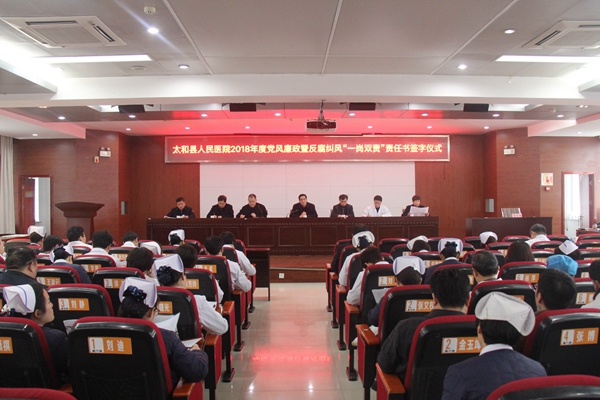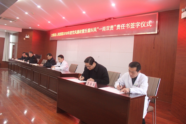 根據全年黨風廉政建設工作部署,2月27日,太和縣人民醫(yī)院舉行2018年黨風廉政暨反腐糾風“一崗雙責”目標責任書簽字儀式。醫(yī)院黨政領導班子、全院中層干部等參加,黨委副書記、副院長孫廷強主持。