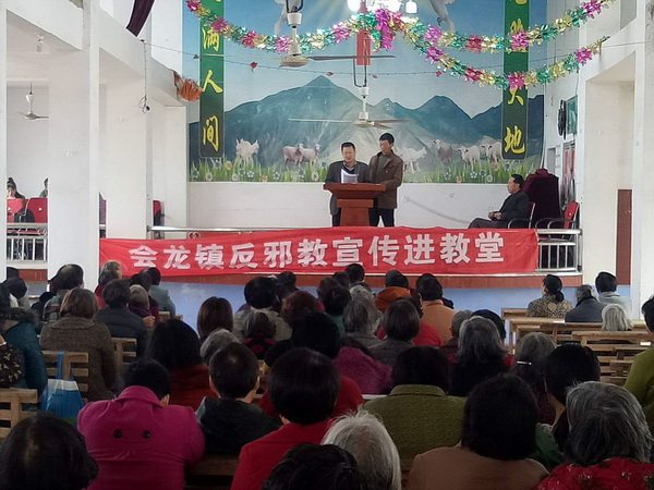 3月25日,會(huì)龍鎮(zhèn)各村支部書記在鎮(zhèn)宣傳委員的帶領(lǐng)下,進(jìn)入教堂宣講十九大精神。