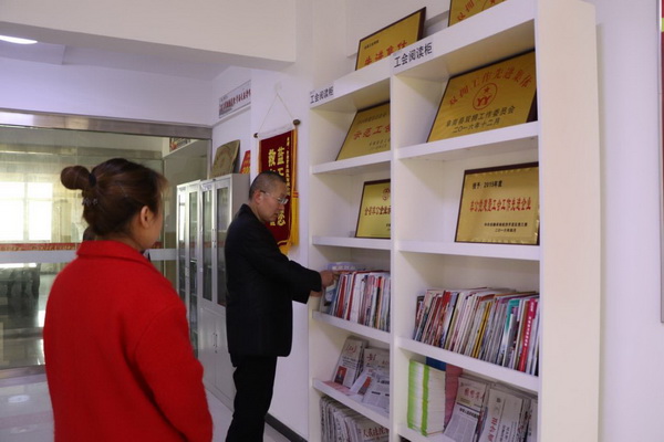 在經(jīng)開區(qū)安徽雪雨潔具有限公司工會(huì)和聯(lián)通公司阜南縣分公司工會(huì),冷治武仔細(xì)查看了書屋藏書、報(bào)刊雜志訂閱量以及各項(xiàng)硬件配備情況,聽取基層工會(huì)主席關(guān)于職工書屋的管理、報(bào)刊雜志閱讀等情況。在認(rèn)真查看職工書屋各項(xiàng)硬件配置和聽取基層工會(huì)主席匯報(bào)后,冷治武指出,企業(yè)工會(huì)要?jiǎng)?chuàng)新職工閱讀方式方法,配備電腦軟件,實(shí)行網(wǎng)上借閱方式,為職工辦理圖書借閱證。要及時(shí)更新圖書種類,增加書籍?dāng)?shù)量,報(bào)刊雜志也要增加訂閱量。要有可上網(wǎng)的電腦,配備兼職圖書管理員,電子音像制品不少于40種(張)。