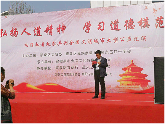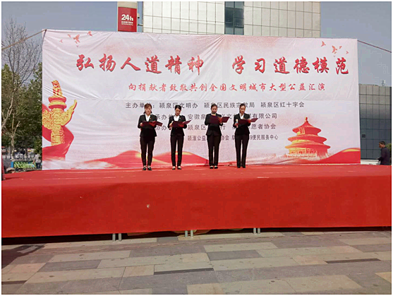 為弘揚(yáng)人道主義精神,共創(chuàng)全國文明城市,2018年5月8日,潁泉區(qū)文明辦、潁泉區(qū)民族宗教局、潁泉區(qū)紅十字會(huì),舉辦了“弘揚(yáng)人道精神 學(xué)習(xí)道德模范”--向捐獻(xiàn)者致敬共創(chuàng)全國文明城市大型公益匯演等系列活動(dòng)。市紅十字會(huì)常務(wù)副會(huì)長李德杰,潁泉區(qū)副區(qū)長李保生,區(qū)委宣傳部副部長、區(qū)文明辦主任張團(tuán)結(jié),區(qū)民族宗教局局長陳亞、區(qū)紅十字會(huì)常務(wù)副會(huì)長張茹共同觀看了演出。