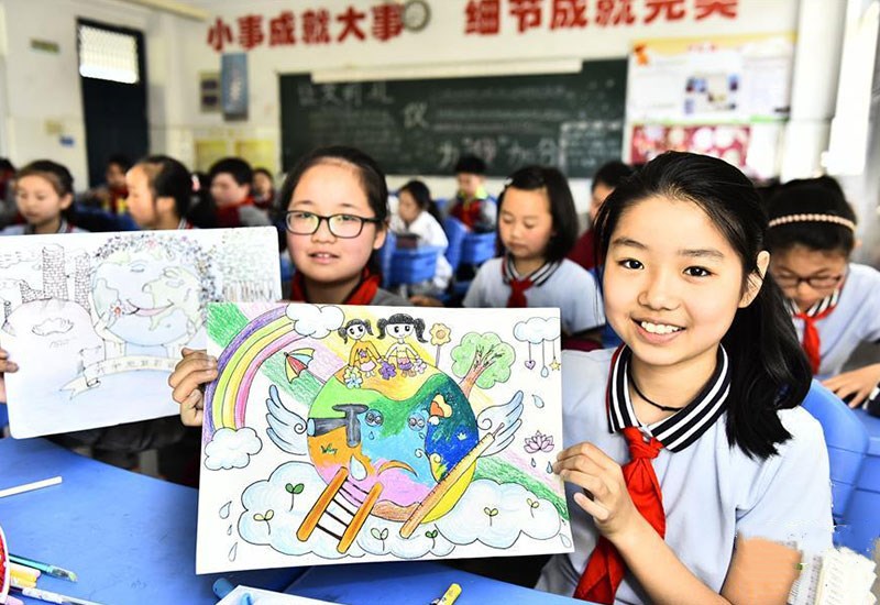 合肥市蜀山區(qū)井崗鎮(zhèn)新城小學(xué)學(xué)生展示自己在“善待地球,童繪藍(lán)天——我與地球的故事”繪畫活動(dòng)中的作品(4月19日攝)。