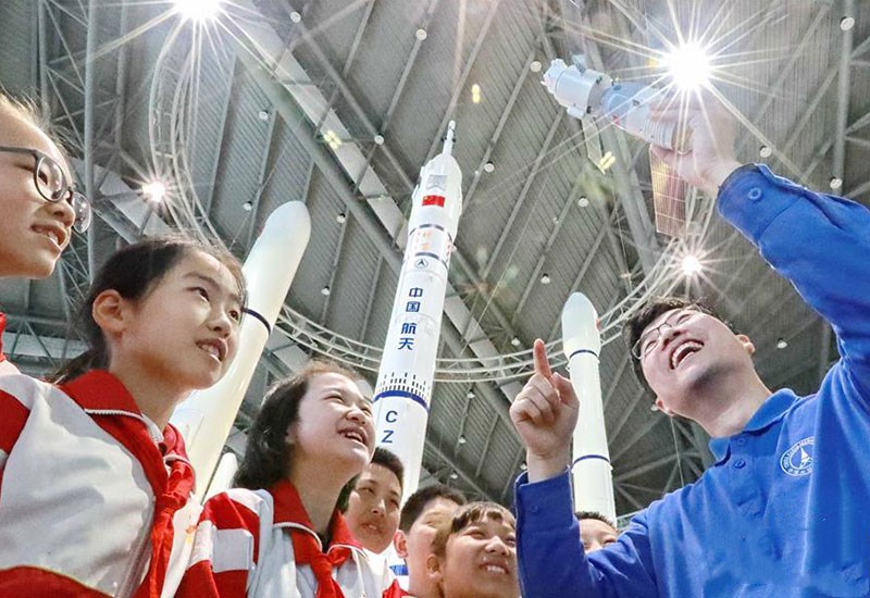 在河北秦皇島軍界·秦皇島軍事科學(xué)教育VR基地,秦皇島無線電管理局工作人員為海港區(qū)新一路小學(xué)學(xué)生講解無線電在航天領(lǐng)域的應(yīng)用(4月23日攝)。