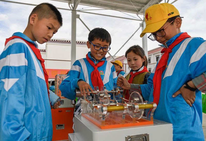 幾名學(xué)生在拉薩市流動(dòng)科技館巡展活動(dòng)現(xiàn)場體驗(yàn)科學(xué)小實(shí)驗(yàn)(5月24日攝)。