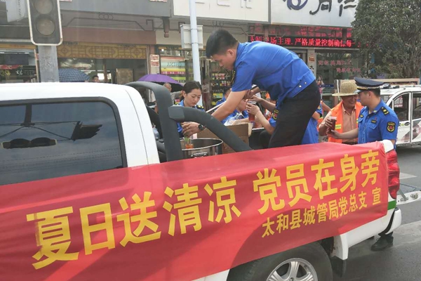 進(jìn)入三伏天后,太和赤日炎炎,熱浪逼人。高溫酷暑下的環(huán)衛(wèi)工人們,為了城市的干凈整潔,不顧自身揮汗如雨,堅守崗位,保護(hù)著城市的每一寸市容??h城管局黨總支及早籌劃,靠前關(guān)愛,發(fā)揮黨員先鋒隊的帶頭模范作用,決定把酷暑下的清涼送給最美的“城市美容師”,向辛勤工作的環(huán)衛(wèi)工人致以親切的問候,感謝他們?yōu)榫S護(hù)整潔、優(yōu)美的城市環(huán)境做出的無私奉獻(xiàn)。