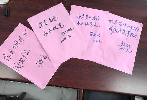 一筆一劃,寫下心中對黨的忠誠和熱愛。在紅色的紙上寫下了對黨要說的心里話。“永遠(yuǎn)擁護(hù)中國共產(chǎn)黨”、“不忘黨的恩情,永遠(yuǎn)跟黨走”……這一字一句是每一位黨員對黨的“真情告白”。