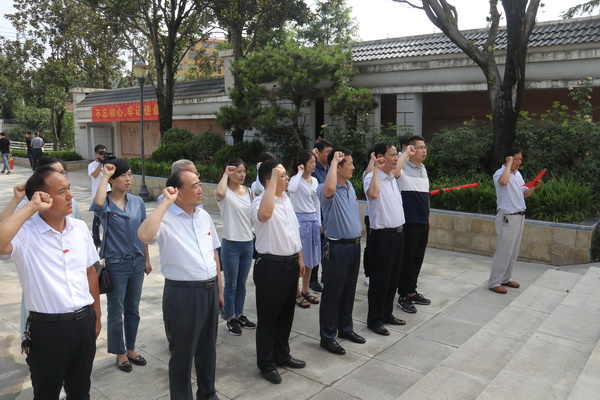 魏野疇烈士的雕塑前,在機(jī)關(guān)黨支部書(shū)記祝永華的領(lǐng)誓下,全體黨員面對(duì)鮮紅的黨旗,舉起右拳,莊嚴(yán)宣誓,錚錚誓言久久回蕩。