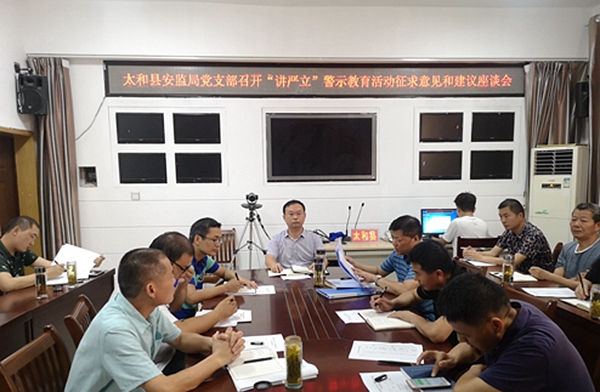 8月6日上午,太和縣安監(jiān)局黨支部召開“講嚴立”警示教育活動征求意見和建議座談會,會議由局黨組書記、局長阮傳宇主持,局全體黨員干部參加。