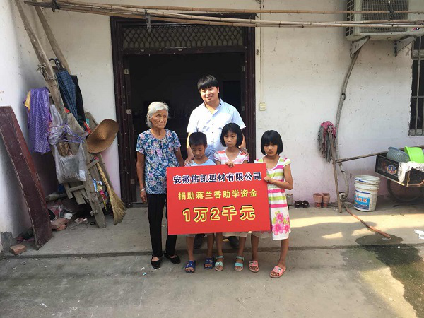 扶貧濟(jì)困、樂善好施是中華民族的傳統(tǒng)美德。8月8日,阜南偉凱型材有限公司總經(jīng)理張威威來到方集鎮(zhèn)大張灣村,向失親的貧困三姐弟捐贈助學(xué)金一萬兩千元,解決他們上學(xué)的難題。