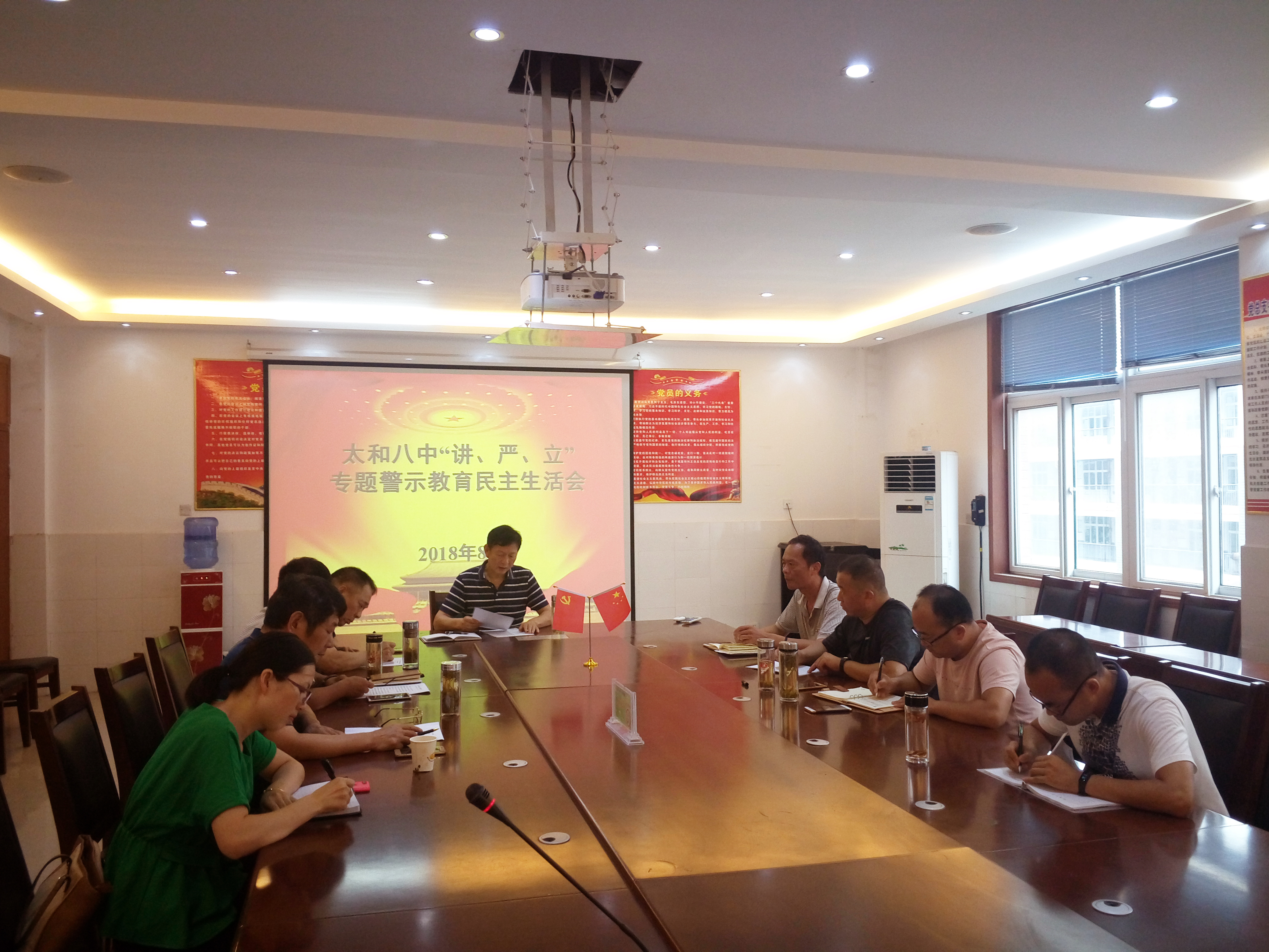 按照太和縣紀(jì)委、太和縣委組織部《中共太和縣紀(jì)委機(jī)關(guān) 中共太和縣委組織部關(guān)于在“講忠誠(chéng)、嚴(yán)紀(jì)律、立政德”專題警示教育中認(rèn)真開(kāi)好專題民主生活會(huì)的通知》(太組通〔2018〕102號(hào))文件要求,2018年8月17日下午,太和八中在校黨員活動(dòng)室召開(kāi)了“講忠誠(chéng)、嚴(yán)紀(jì)律、立政德”專題警示教育民主生活會(huì)。會(huì)議由校黨總支書記、校長(zhǎng)王安康同志主持,校黨總支成員、校領(lǐng)導(dǎo)班子、各支部書記參加了會(huì)議。