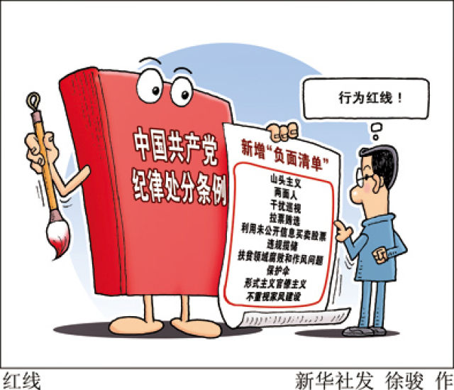 根據(jù)全面從嚴治黨的新形勢新要求,特別是針對近年來發(fā)現(xiàn)的突出問題和新型違紀行為,新條例增寫了不少條款,進一步扎緊依規(guī)管黨治黨的制度籠子。這些新增“負面清單”,給黨員干部劃出了哪些行為紅線?