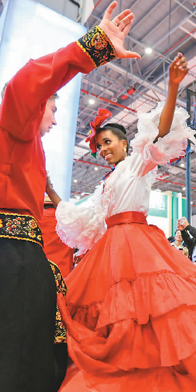 11月8日,一名多米尼加舞者(紅裙者)和一名俄羅斯舞者在進(jìn)博會展館內(nèi)起舞。新華社記者 張玉薇 攝