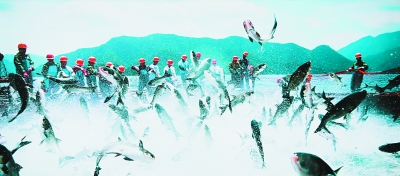 企業(yè)與地方聯(lián)合發(fā)展生態(tài)綠色經(jīng)濟(jì),在千島湖創(chuàng)新發(fā)展“保水漁業(yè)”,使當(dāng)?shù)氐木G水青山變成了金山銀山。圖為千島湖巨網(wǎng)捕魚(yú)的壯觀景象。(資料圖片)