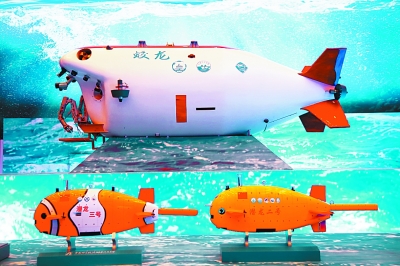 “可上九天攬?jiān)?,可下五洋捉鱉”。一邊是航天技術(shù)展區(qū),一邊是航海技術(shù)展區(qū),完美對(duì)應(yīng)著詩(shī)句,一上一下,延展著人類(lèi)對(duì)于世界的認(rèn)知和想象。天宮二號(hào)空間實(shí)驗(yàn)室、嫦娥三號(hào)月球探測(cè)器以及蛟龍、海龍、潛龍“三龍兄弟”深海探測(cè)裝備模型,讓很多在場(chǎng)的孩子發(fā)出贊嘆之聲。