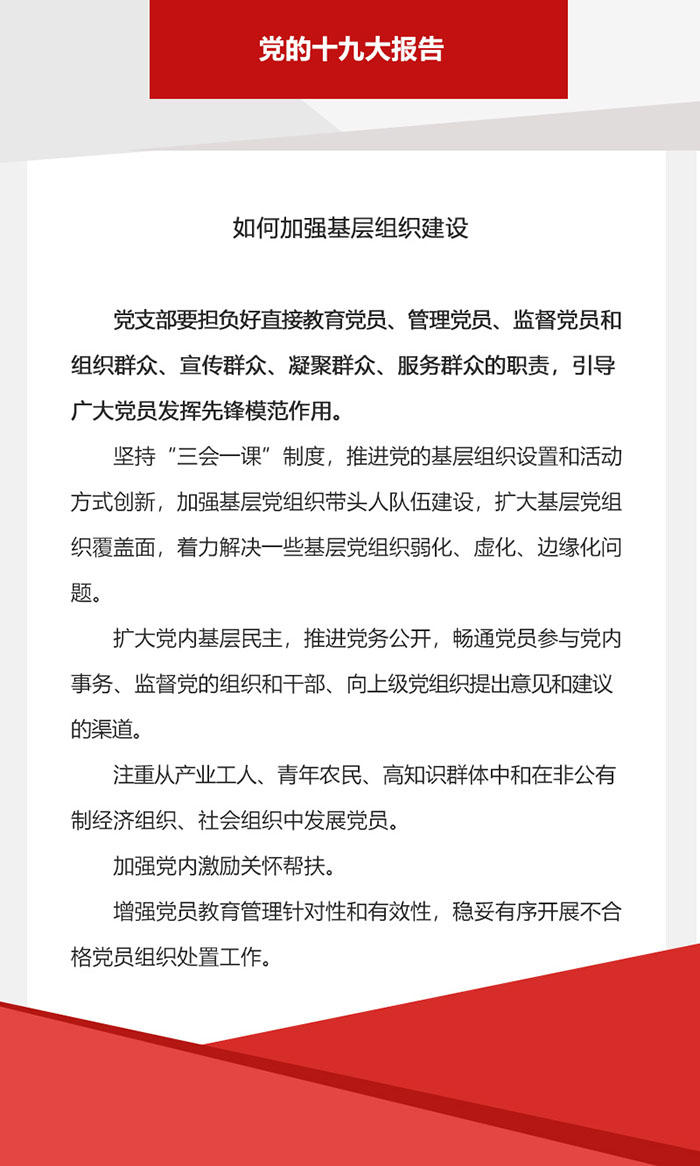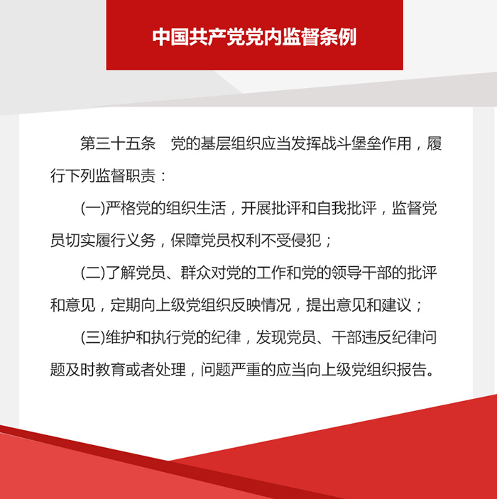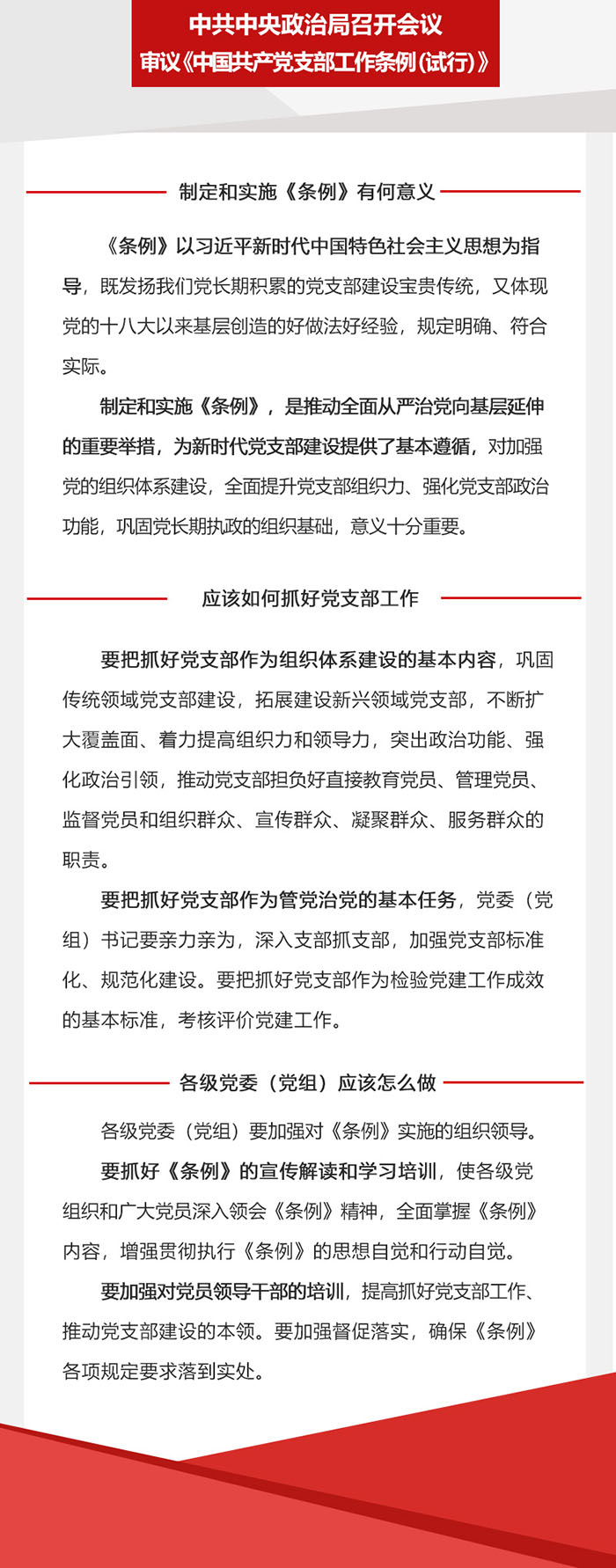黨支部是黨的基礎(chǔ)組織,是黨的組織體系的基本單元。不久之前,中共中央政治局召開會(huì)議,審議了《中國共產(chǎn)黨支部工作條例(試行)》。會(huì)議認(rèn)為,制定和實(shí)施《條例》,是推動(dòng)全面從嚴(yán)治黨向基層延伸的重要舉措,為新時(shí)代黨支部建設(shè)提供了基本遵循,對(duì)加強(qiáng)黨的組織體系建設(shè),全面提升黨支部組織力、強(qiáng)化黨支部政治功能,鞏固黨長期執(zhí)政的組織基礎(chǔ),意義十分重要。那么,黨支部工作都包含哪些方面?讓我們透過這些重要文件來看一看。