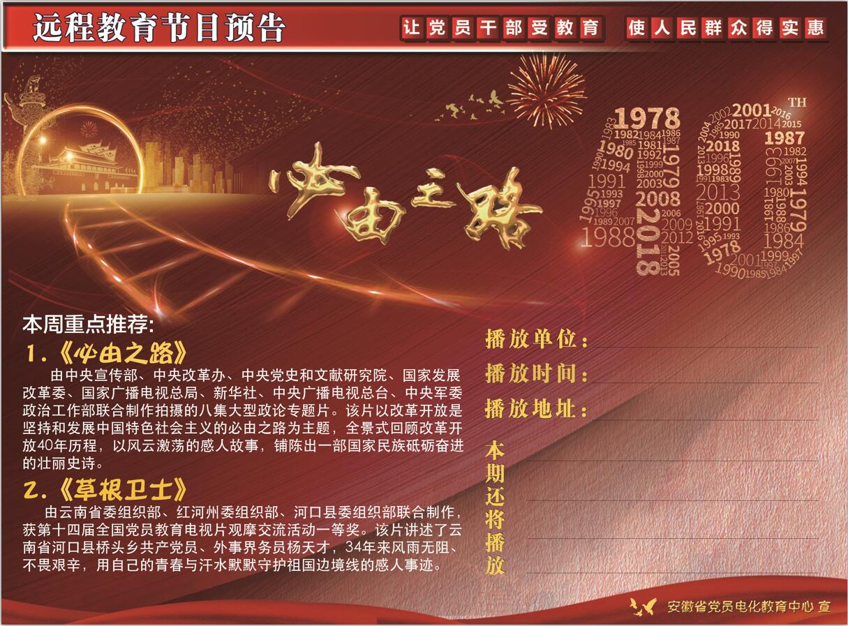 1.《必由之路》(由中央宣傳部、中央改革辦、中央黨史和文獻(xiàn)研究院、國(guó)家發(fā)展改革委、國(guó)家廣播電視總局、新華社、中央廣播電視總臺(tái)、中央軍委政治工作部聯(lián)合制作拍攝的八集大型政論專題片。該片以改革開放是堅(jiān)持和發(fā)展中國(guó)特色社會(huì)主義的必由之路為主題,全景式回顧改革開放40年歷程,以風(fēng)云激蕩的感人故事,鋪陳出一部國(guó)家民族砥礪奮進(jìn)的壯麗史詩(shī)。)