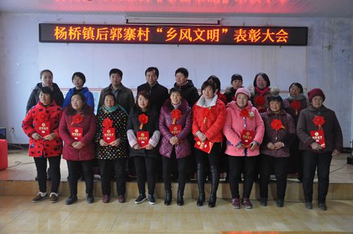 為弘揚優(yōu)秀傳統(tǒng)文化,營造文明和諧新風(fēng),助力脫貧攻堅,12月25日,楊橋鎮(zhèn)后郭寨村舉行“鄉(xiāng)風(fēng)文明”表彰大會,對村內(nèi)涌現(xiàn)出的孝老愛親、敬業(yè)奉獻、堅守正道的“好婆婆”、“好媳婦”、“鄉(xiāng)賢”“十佳少年”、“清潔文明戶”等20人進行表彰,并頒發(fā)榮譽證書。