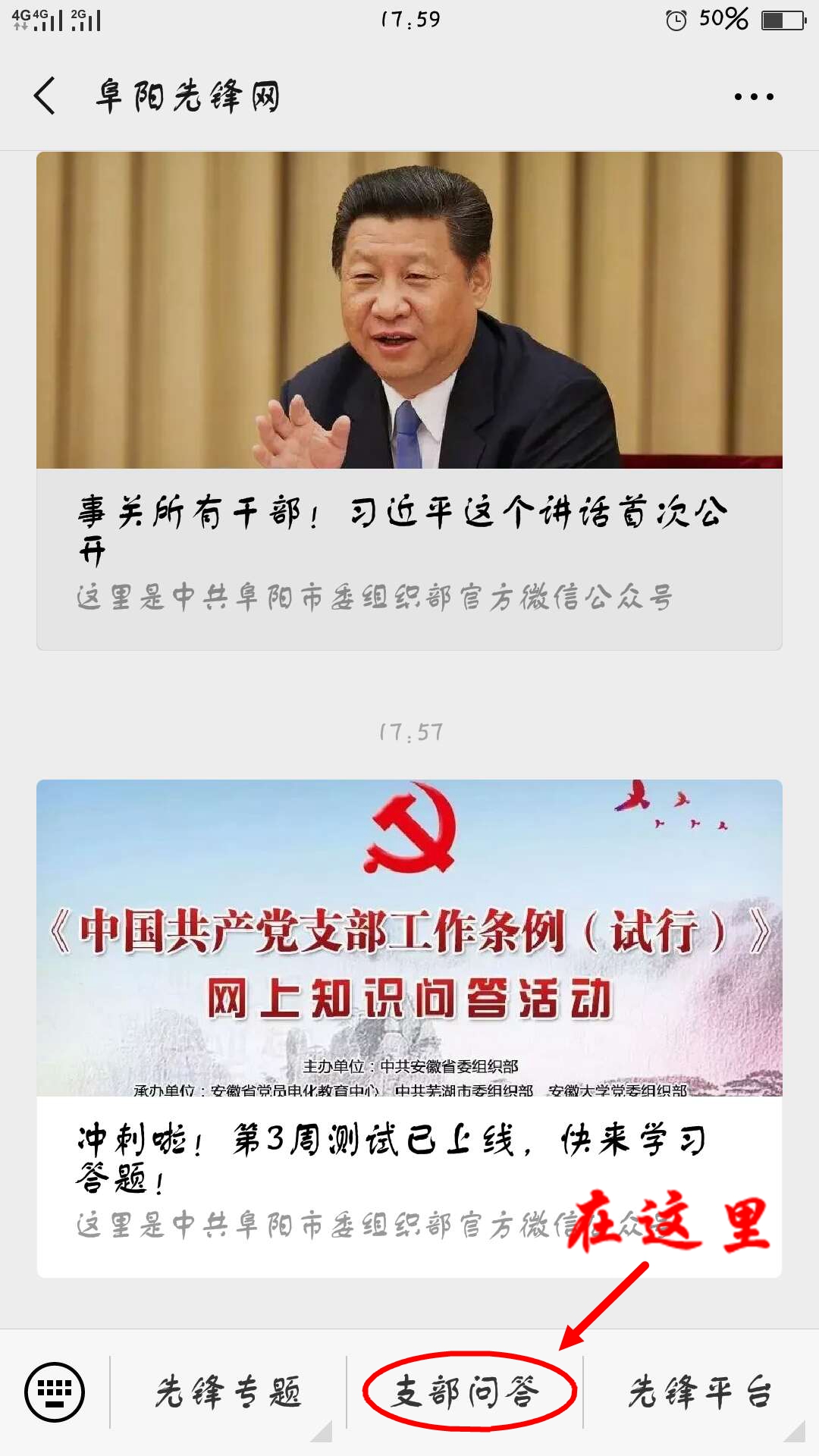 4.阜陽先鋒網(wǎng)微信公眾號(hào)也對(duì)支部答題活動(dòng)進(jìn)行了鏈接,點(diǎn)擊進(jìn)去即可參與答題。