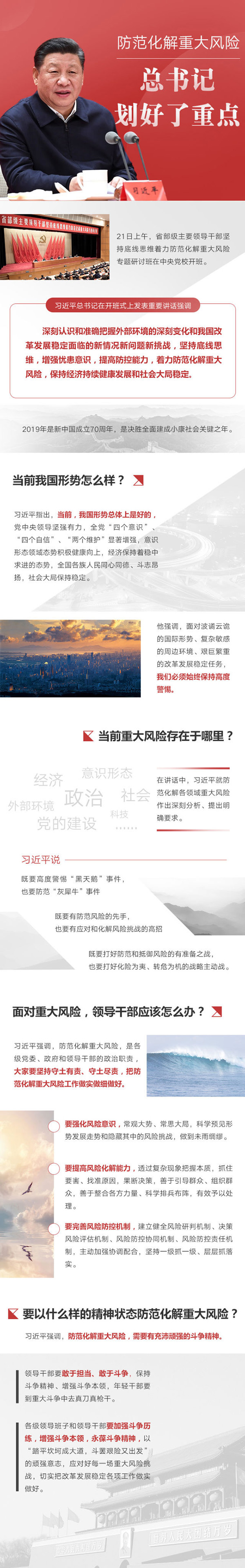 習近平總書記在講話中強調,防范化解重大風險,是各級黨委、政府和領導干部的政治職責,大家要堅持守土有責、守土盡責,把防范化解重大風險工作做實做細做好。