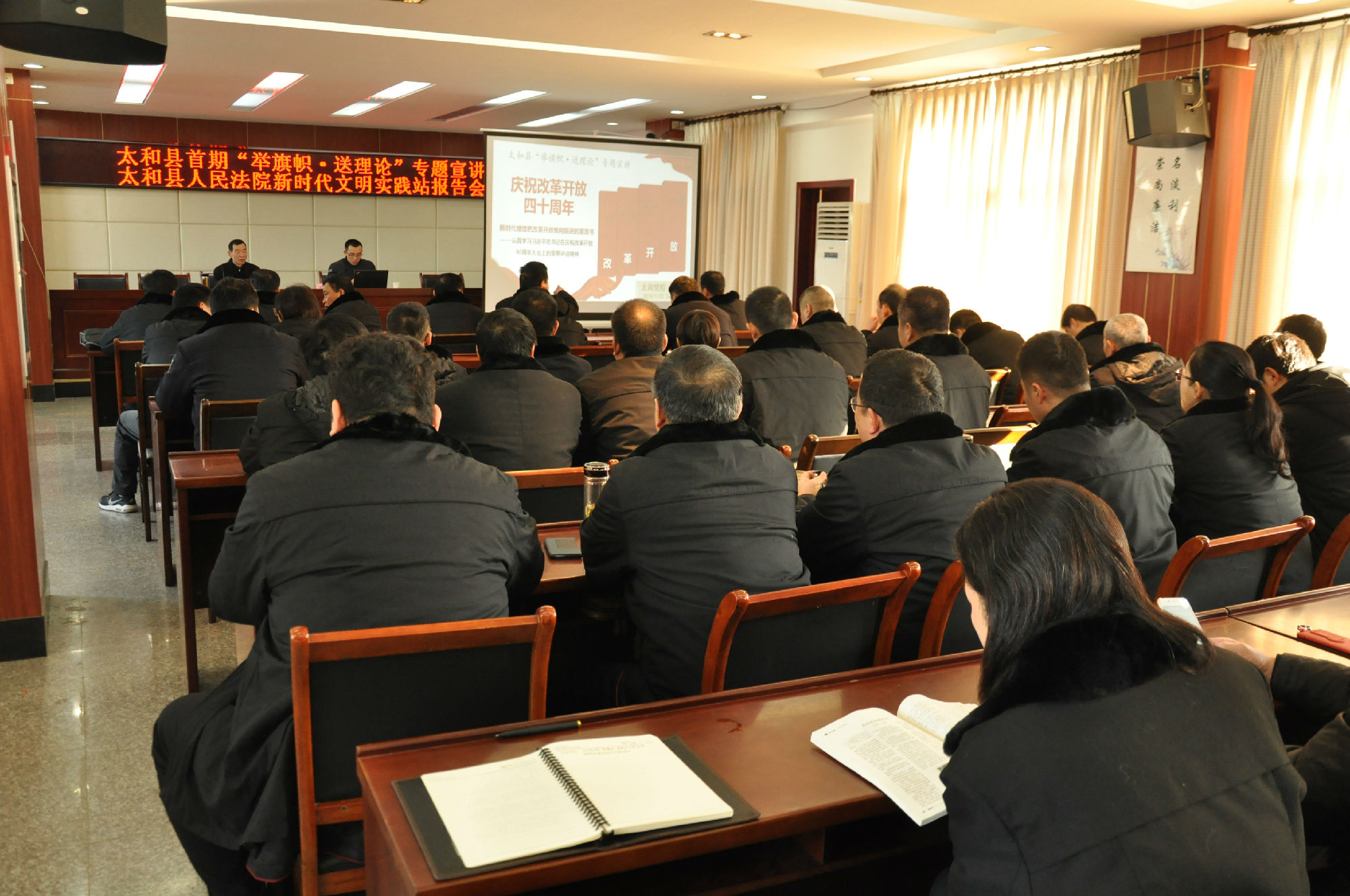 2019年1月22日上午,太和縣人民法院舉辦太和縣首期“舉旗幟 送理論”專題宣講報告會。會議由太和縣委講師組成員、縣委黨校講師王朗主講,太和法院黨組副書記劉獻忠主持報告會,院全體干警對講課內容進行了學習。