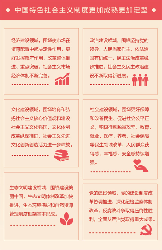 守正創(chuàng)新的生動(dòng)體現(xiàn)。改革開放以來(lái),我們堅(jiān)持守正創(chuàng)新的基本邏輯、價(jià)值取向,既表現(xiàn)出志不改、道不變的堅(jiān)定,也表現(xiàn)出大膽地試、勇敢地改的決斷;既注意到社會(huì)變革的深刻性、廣泛性、復(fù)雜性,又保持了社會(huì)發(fā)展的方向性、穩(wěn)定性、延續(xù)性。對(duì)于中國(guó)制度而言,就是堅(jiān)持和完善根本政治制度、基本政治制度、基本經(jīng)濟(jì)制度,完善中國(guó)特色社會(huì)主義法律體系,不斷創(chuàng)新經(jīng)濟(jì)體制、政治體制、文化體制、社會(huì)體制、生態(tài)文明體制等各項(xiàng)具體制度。比如,從經(jīng)濟(jì)領(lǐng)域來(lái)看,我們既始終堅(jiān)持公有制經(jīng)濟(jì)為主體,又不斷探索基本經(jīng)濟(jì)制度有效實(shí)現(xiàn)形式,筑牢了鞏固和發(fā)展中國(guó)制度的基礎(chǔ);我們既始終堅(jiān)持發(fā)揮社會(huì)主義制度的優(yōu)越性,又注重突破舊的經(jīng)濟(jì)體制束縛,建立起社會(huì)主義市場(chǎng)經(jīng)濟(jì)體制,實(shí)現(xiàn)了社會(huì)主義基本制度與市場(chǎng)經(jīng)濟(jì)體制相結(jié)合的偉大創(chuàng)舉。黨的十八屆三中全會(huì)以來(lái),以習(xí)近平同志為核心的黨中央圍繞全面深化改革總目標(biāo),著力抓好重大制度創(chuàng)新,全面深化經(jīng)濟(jì)、政治、文化、社會(huì)、生態(tài)文明體制和黨的建設(shè)制度改革。目前,黨的十八屆三中全會(huì)提出的336項(xiàng)重大改革舉措中已出臺(tái)實(shí)施方案的超過95%,中國(guó)制度守正創(chuàng)新結(jié)出累累碩果。
