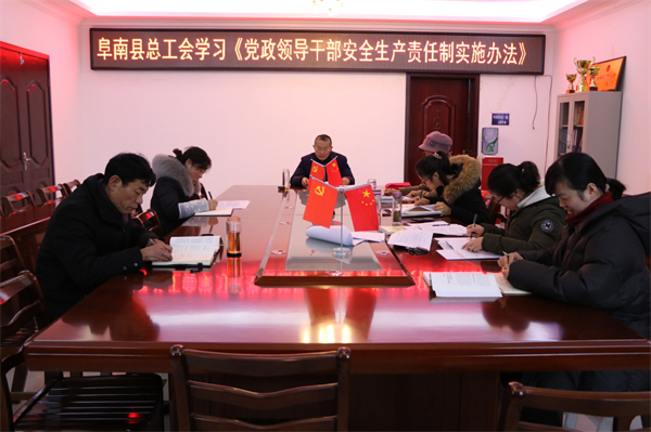 2月14日,阜南縣總工會(huì)組織機(jī)關(guān)全體人員學(xué)習(xí)《黨政領(lǐng)導(dǎo)干部安全生產(chǎn)責(zé)任制實(shí)施辦法》。縣總工會(huì)黨組書記、副主席冷治武主持學(xué)習(xí)并講話,黨組成員、副主席申靈出席會(huì)議。