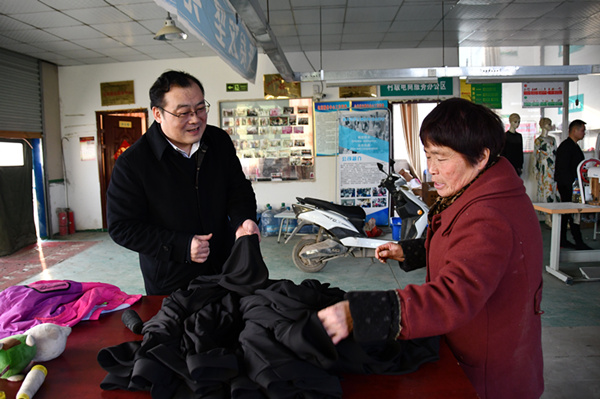 隨后,劉洪潔來到該社區(qū)的扶貧車間“姜大姐手工編織合作社”,與在車間內(nèi)務(wù)工的貧困戶劉桂英進(jìn)行了現(xiàn)場(chǎng)交流,詢問她家的脫貧情況,了解她在扶貧車間的務(wù)工收入、車間的日常運(yùn)轉(zhuǎn)和吸納貧困戶務(wù)工情況,并誠(chéng)懇征求她對(duì)脫貧攻堅(jiān)工作的意見建議。