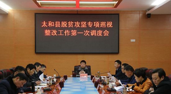 為確保高效高質(zhì)完成脫貧攻堅巡視整改工作,2月26日,太和縣召開脫貧攻堅專項(xiàng)巡視整改工作第一次調(diào)度會,縣直28家有關(guān)單位主要負(fù)責(zé)人參加了會議,縣委常委、副縣長海治國主持會議,縣委副書記、政法委書記潘江徽出席并講話。