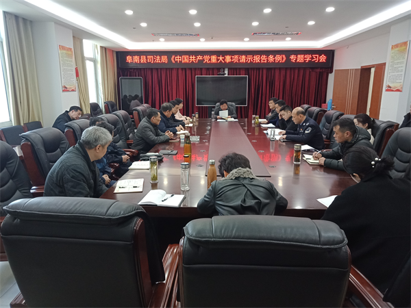 3月12日上午,阜南縣司法局召開《中國共產黨重大事項請示報告條例》專題學習會,會議由局黨組書記、局長丁傳珠主持,局機關全體人員參加會議。