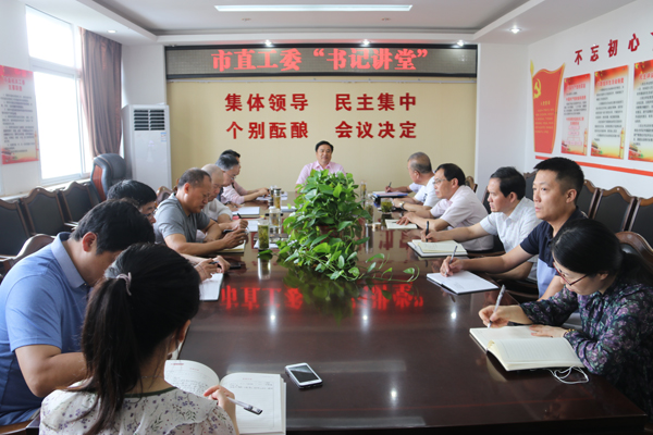 7月11日,市直工委副書記、黨支部書記周君以《守初心、擔(dān)使命 做好市直機(jī)關(guān)黨建工作》為題,為工委黨員干部上黨課。市直工委書記李濤主持會議。