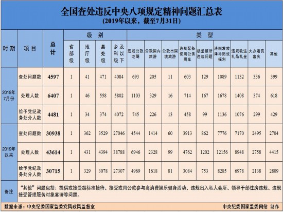 在2019年7月份查處的4597起問(wèn)題中,違規(guī)收送禮品禮金1132起、違規(guī)發(fā)放津補(bǔ)貼或福利1089起、違規(guī)公款吃喝693起、違規(guī)配備使用公務(wù)用車603起、大辦婚喪喜慶336起、公款國(guó)內(nèi)旅游205起、樓堂館所違規(guī)問(wèn)題129起、公款出國(guó)境旅游11起、其他問(wèn)題(包括提供或接受超標(biāo)準(zhǔn)接待、接受或用公款參與高消費(fèi)娛樂健身活動(dòng)、違規(guī)出入私人會(huì)所、領(lǐng)導(dǎo)干部住房違規(guī)、違規(guī)接受管理服務(wù)對(duì)象宴請(qǐng)等問(wèn)題)399起。