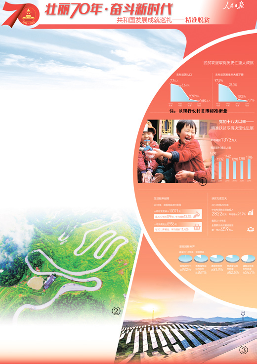如今,中國(guó)特色的脫貧攻堅(jiān)制度體系基本建立,責(zé)任體系、政策體系、考核體系等構(gòu)建起頂層設(shè)計(jì)的“四梁八柱”。精準(zhǔn)施策,對(duì)癥下藥,貧困地區(qū)迎來了歷史性的跨越和巨變:70年間,全國(guó)貧困發(fā)生率大幅下降,到2018年底降至1.7%。透過數(shù)字看變化,腰包更鼓了,貧困地區(qū)農(nóng)民收入近6年年均增長(zhǎng)12.1%,增幅高于全國(guó)平均水平;條件更好了,99.5%的村通了硬化路,96.5%的村通了客車,改水改廁等讓村莊更加宜居;生活質(zhì)量高了,近6年貧困地區(qū)農(nóng)民人均消費(fèi)支出年均增長(zhǎng)11.4%。