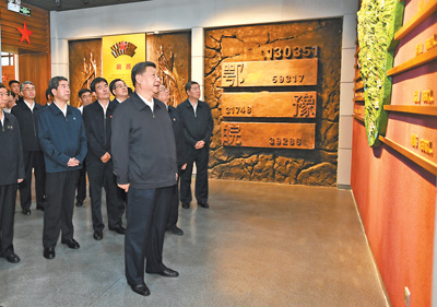 接著,習(xí)近平來(lái)到鄂豫皖蘇區(qū)首府革命博物館,了解鄂豫皖蘇區(qū)的革命歷史。鄂豫皖蘇區(qū)是中國(guó)共產(chǎn)黨在土地革命戰(zhàn)爭(zhēng)時(shí)期領(lǐng)導(dǎo)創(chuàng)建的根據(jù)地之一,是僅次于中央蘇區(qū)的第二大革命根據(jù)地,誕生了多支紅軍主力,創(chuàng)造了“28年紅旗不倒”的奇跡。解放戰(zhàn)爭(zhēng)時(shí)期,這里是劉鄧大軍千里挺進(jìn)大別山的落腳地。博物館展陳了許多珍貴的革命文物,習(xí)近平駐足察看,不時(shí)同大家交流,追憶崢嶸歲月。習(xí)近平強(qiáng)調(diào),開(kāi)展“不忘初心、牢記使命”主題教育,黨員、干部要多學(xué)黨史、新中國(guó)史,自覺(jué)接受紅色傳統(tǒng)教育,常學(xué)常新,不斷感悟,鞏固和升華理想信念。革命博物館、紀(jì)念館、黨史館、烈士陵園等是黨和國(guó)家紅色基因庫(kù)。要講好黨的故事、革命的故事、根據(jù)地的故事、英雄和烈士的故事,加強(qiáng)革命傳統(tǒng)教育、愛(ài)國(guó)主義教育、青少年思想道德教育,把紅色基因傳承好,確保紅色江山永不變色。