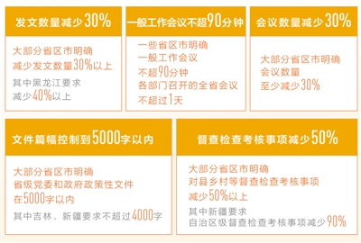 記者梳理各地落實(shí)舉措發(fā)現(xiàn),在減少發(fā)文數(shù)量上,福建、山西、河北等多個(gè)省份都明確要求,發(fā)給縣級以下的文件減少30%—50%。黑龍江省規(guī)定,以省、市名義印發(fā)縣級以下的文件,要比2018年減少40%左右。