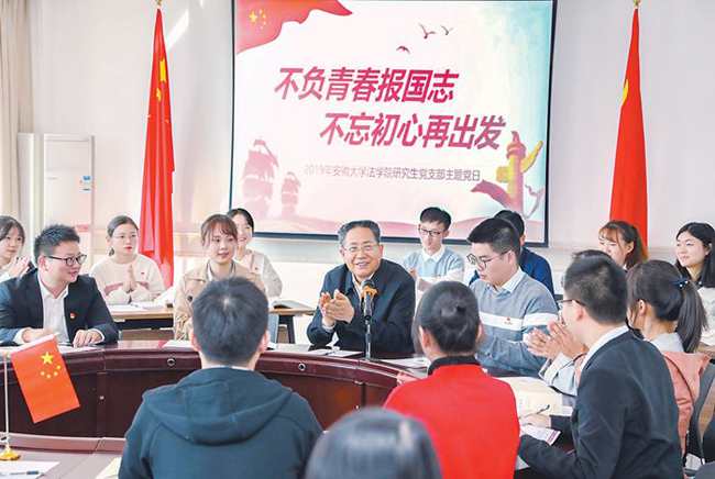 10月15日上午,省委書記李錦斌來到安徽大學(xué)法學(xué)院研究生黨支部舉行“不負(fù)青春報(bào)國(guó)志不忘初心再出發(fā)”主題黨日活動(dòng)現(xiàn)場(chǎng),與同學(xué)們圍坐在一起,談初心、說使命、話報(bào)國(guó),勉勵(lì)大家發(fā)揚(yáng)老一輩光榮傳統(tǒng),爭(zhēng)做有理想、有本領(lǐng)、有擔(dān)當(dāng)?shù)男聲r(shí)代德法兼修高素質(zhì)人才。本網(wǎng)記者 徐國(guó)康 攝