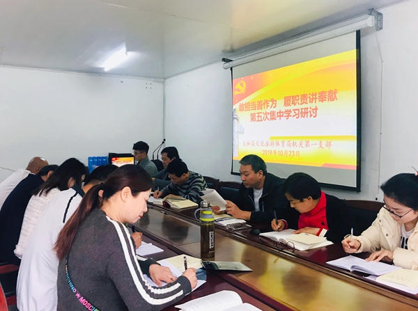 10月23日下午,太和縣文旅體局機關(guān)第一支部組織全體黨員召開“敢擔(dān)當(dāng)善作為 履職責(zé)講奉獻(xiàn)”專題學(xué)習(xí)研討會,這是該局“不忘初心、牢記使命”主題教育第五次集中專題學(xué)習(xí)。