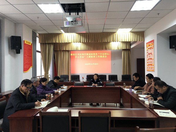 為深入開展“不忘初心、牢記使命”主題教育工作,教育引導(dǎo)退休黨員干部發(fā)揚(yáng)革命傳統(tǒng)和優(yōu)良作風(fēng),繼續(xù)為黨和人民的事業(yè)發(fā)光發(fā)熱,11月29日,潁泉區(qū)司法局開展退休黨員“不忘初心、牢記使命”主題教育工作推進(jìn)會(huì),對(duì)主題教育進(jìn)行再部署、再推進(jìn)。