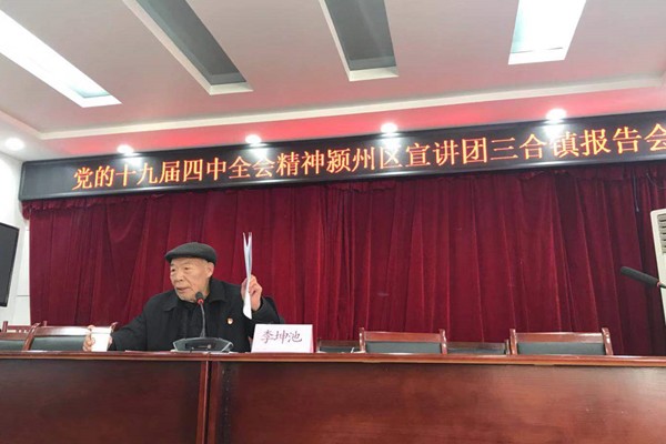 12月3日上午,潁州區(qū)三合鎮(zhèn)舉辦學(xué)習(xí)貫徹十九屆四中全會(huì)精神專題報(bào)告會(huì)。邀請(qǐng)全國(guó)理論宣講先進(jìn)個(gè)人、潁州區(qū)理論宣講團(tuán)成員、三合鎮(zhèn)“老喇叭”李坤池作專題報(bào)告,報(bào)告會(huì)由鎮(zhèn)黨委副書記馬海林主持,各村(居)書記、組織委員、部門專干等共計(jì)40余人聆聽了報(bào)告。