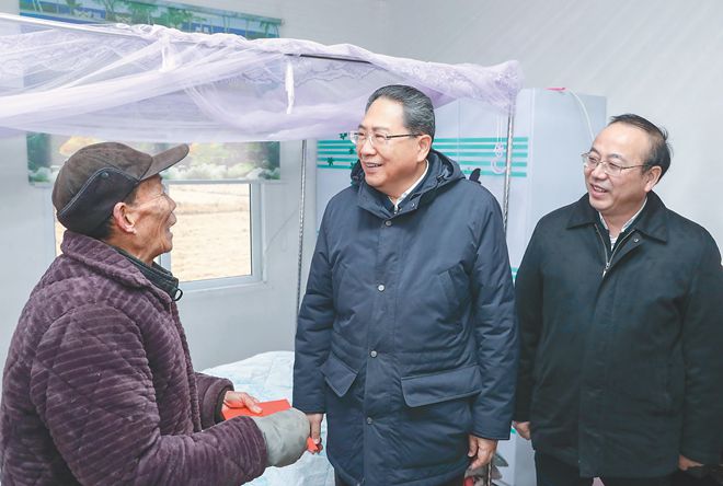 1月7日,省委書記李錦斌冒雨來到定遠縣吳圩鎮(zhèn)高埂村,登門看望烈軍屬李德豐,與他親切交談,噓寒問暖,詳細詢問生產(chǎn)生活情況。本報記者 徐國康 攝