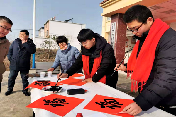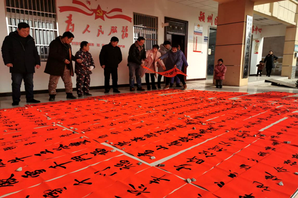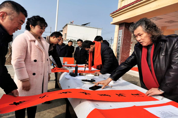 2019年1月14日,農(nóng)歷臘月二十,安徽省潁州區(qū)西湖鎮(zhèn)大許村黨群服務(wù)中心門前的廣場(chǎng)上一片紅彤彤景象,阜陽市書法家協(xié)會(huì)副主席王建濤及寒假回鄉(xiāng)的書法專業(yè)大學(xué)生張若愚、姜浩瀚正在這里為村民們揮毫潑墨寫春聯(lián)。