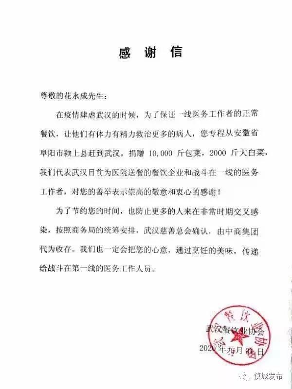 花永城在慎城鎮(zhèn)長(zhǎng)期從事水產(chǎn)養(yǎng)殖,突如其來(lái)的新型冠狀病毒感染的肺炎疫情肆虐著武漢也更牽動(dòng)著他的心。捐獻(xiàn)的蔬菜運(yùn)至指定地點(diǎn)后,由武漢市商務(wù)局接收并妥善保存,武漢餐飲業(yè)協(xié)會(huì)代表目前為醫(yī)院送餐的餐飲企業(yè)和戰(zhàn)斗在一線的醫(yī)務(wù)工作者對(duì)此善舉表示崇高的敬意和衷心的感謝!花永城與同車(chē)人員返潁后,按照社區(qū)要求,立即采取居家隔離措施,進(jìn)行觀察,確保安全,體現(xiàn)了一名共產(chǎn)黨員“越是困難越向前”的先鋒模范作用。
