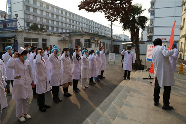 為全面貫徹落實(shí)習(xí)近平總書記對(duì)做好新型冠狀病毒感染的肺炎疫情防控工作的重要指示,按照上級(jí)黨委疫情防控工作的部署要求。2月3日,中鐵阜陽中心醫(yī)院黨總支在西區(qū)住院部門口,舉行戰(zhàn)疫黨員突擊隊(duì)授旗儀式,醫(yī)院黨總支副書記、院長張桂紅主持儀式,黨總支領(lǐng)導(dǎo)班子、全體黨員參加儀式。首先,醫(yī)院黨總支書記唐勤輝,宣讀成立戰(zhàn)疫黨員突擊隊(duì)相關(guān)文件并作動(dòng)員講話,一是要求各黨支部要充分發(fā)揮戰(zhàn)斗堡壘作用,全體黨員要發(fā)揮黨員先鋒模范作用,沖鋒在一線、戰(zhàn)斗在一線,以對(duì)黨和人民群眾高度負(fù)責(zé)的態(tài)度,敢于擔(dān)當(dāng)、勇于作為,堅(jiān)決打贏疫情防控阻擊戰(zhàn)。二是要求全體黨員要在醫(yī)院最需要的時(shí)候,沖在臨床一線,要在醫(yī)院設(shè)立的黨員先鋒崗、兩個(gè)院區(qū)黨員志愿服務(wù)點(diǎn)盡職盡責(zé),完成防控戰(zhàn)疫各項(xiàng)任務(wù)。三是要求全體黨員切實(shí)扛起疫情防控政治責(zé)任,主動(dòng)擔(dān)當(dāng)、認(rèn)真履職,全力保障阜城人民群眾生命安全和身體健康。