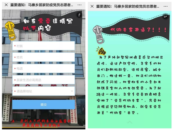 為了解決居民生活物資的需求,馬寨鄉(xiāng)黨員干部開動腦筋,由63名黨員志愿者組建了11支居家防疫“紅色代購服務(wù)隊(duì)”,并開設(shè)了“紅色代購直通車”微信小服務(wù)。通過馬寨鄉(xiāng)“紅色代購直通車”填寫所需生活物品、所在村(居)姓名及聯(lián)系方式后,由63名志愿者在后臺進(jìn)行梳理匯總,統(tǒng)一采購并免費(fèi)送貨上門,滿足群眾在疫情期間生活物資需求。截止目前已為54戶群眾提供了代購送貨上門服務(wù)。