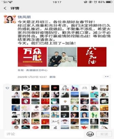 饒豐麗是臨泉縣高塘鎮(zhèn)副鎮(zhèn)長,在大年初一她就感受到了疫情的嚴重形勢。在饒豐麗負責(zé)的臨泉縣高塘鎮(zhèn)人民政府微信公眾號中,大年初一晚上9:24的推送中有這么一條:《阜陽市新型冠狀病毒感染的肺炎疫情防控指揮部通告(第一號)》,里面詳細介紹了阜陽市新型冠狀病毒感染的肺炎疫情防控指揮部為做好疫情防控工作采取的具體管控措施。