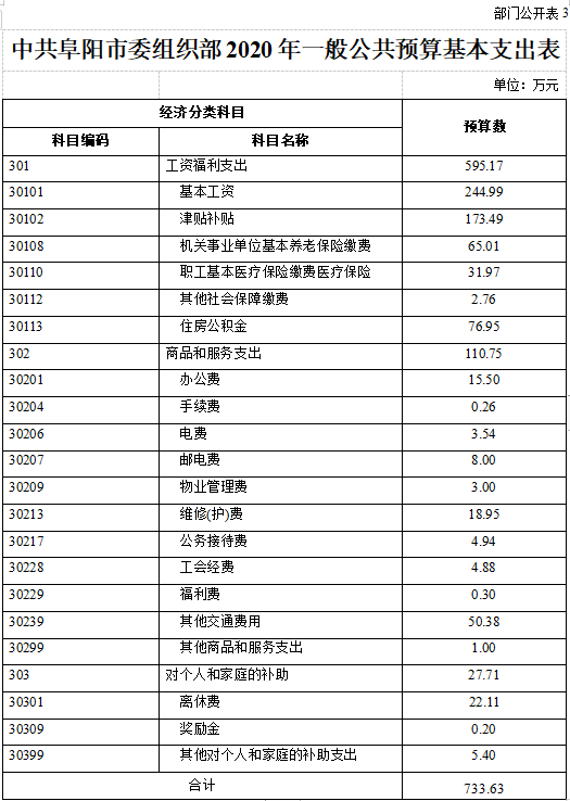 中共阜陽市委組織部2020年一般公共預(yù)算基本支出733.63萬元,其中:
