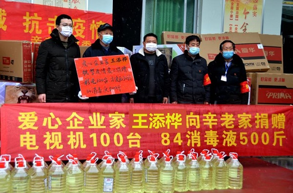 身在外地,心在家鄉(xiāng),在外流動黨員獻愛心。“疫情施虐,國難當前,深刻感受到你們的辛苦和不易。我雖人在他鄉(xiāng),不能親自履行黨員義務,但作為咱們村黨組織的一員,希望能盡一絲微薄之力。”一直在江蘇務工未能返鄉(xiāng)的臨泉縣長官鎮(zhèn)袁莊村流動黨員李靜,在微信捐款200元后向黨組織寫下的捐款留言。為了豐富村民,尤其是年邁留守老人居家隔離期間的精神文化生活,消除寂寞,并保障衛(wèi)生和生活需要,2月15日,遠在深圳的臨泉縣駐深圳流動黨員黨支部書記、臨泉籍安徽鑫林集團董事長王添樺,委托人員冒著雨雪,將價值25萬元的愛心物資,包括100臺平板電視機、500斤84消毒液、30箱方便面等等,專程送到家鄉(xiāng)鲖城鎮(zhèn)辛老家村,支持家鄉(xiāng)抗“疫”。