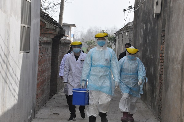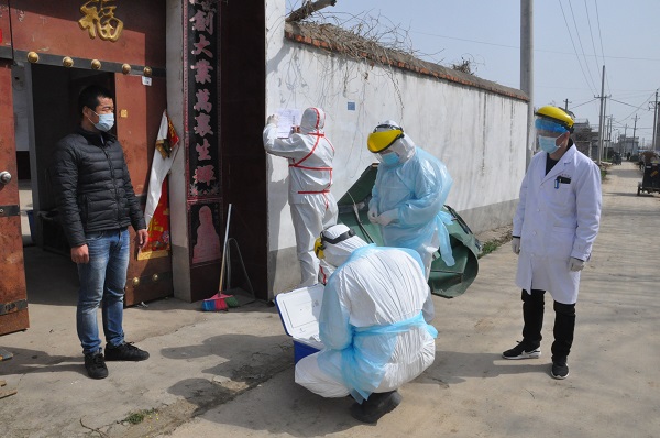 “您好,我們是楊橋鎮(zhèn)衛(wèi)生院的醫(yī)生,來進行核酸檢測取樣,您別緊張,也別害怕,咱們先來聊聊天,我問您答就好了,您是什么時候到家的?乘坐什么交通工具?近期有沒有不舒服之類的?這位入戶核實信息的醫(yī)務人員名叫郭振,他是楊橋鎮(zhèn)衛(wèi)生院委員會的委員,由他帶領本院的防疫人員魏婷婷,馬亞龍,李強組成的核酸檢測篩查隊,每天深入21個村社區(qū)隔離對象家中,入戶采集核酸檢測樣本。