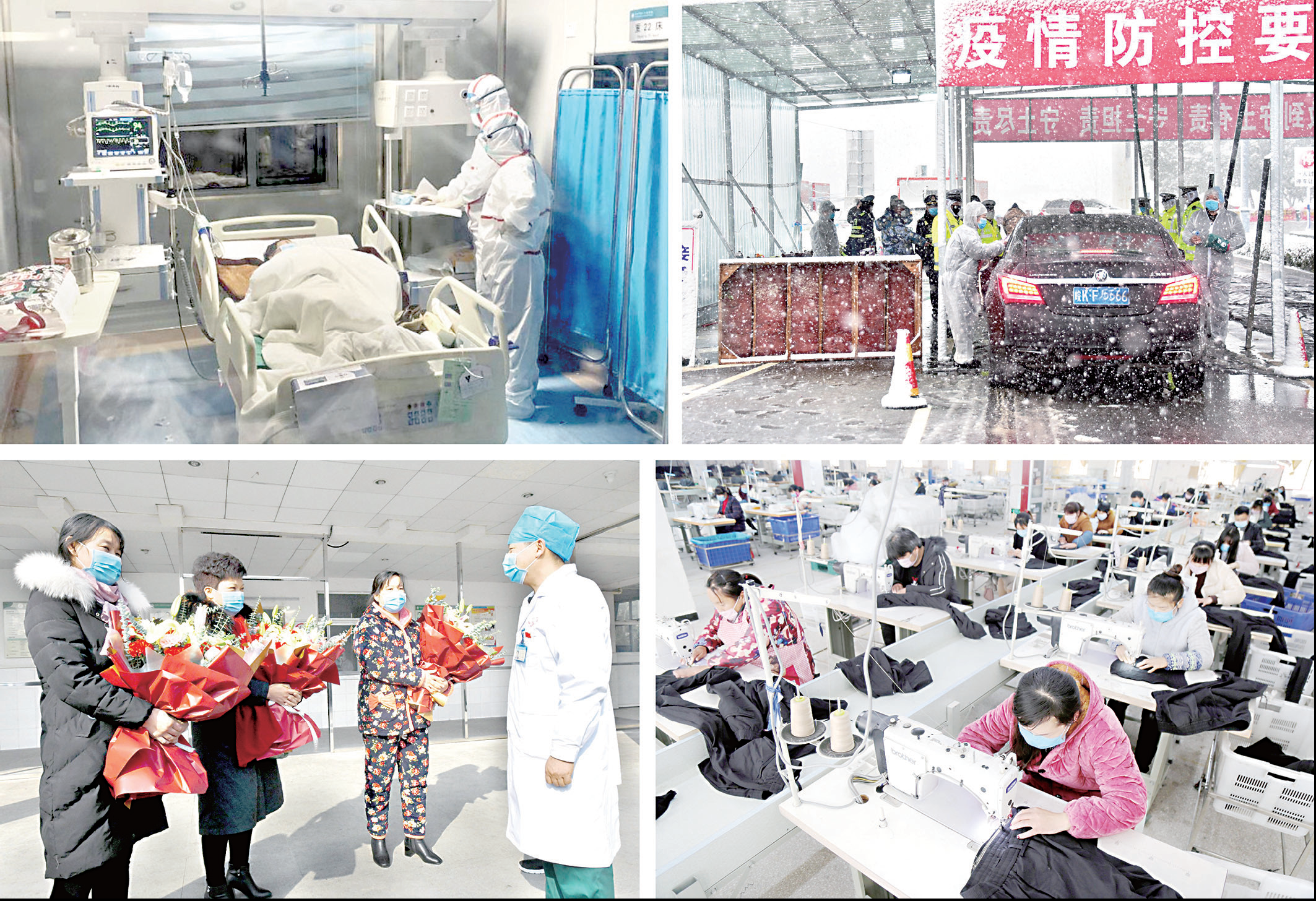 ①市二院醫(yī)護(hù)人員在監(jiān)測(cè)患者病情。②工作人員冒著風(fēng)雪在省道202田集鎮(zhèn)檢測(cè)點(diǎn)值守,做好過(guò)往人員、車輛測(cè)溫、登記。③治愈出院的新冠肺炎患者向醫(yī)護(hù)人員表示感謝。④在政府和金融機(jī)構(gòu)的支持幫助下,阜陽(yáng)界首高新區(qū)的一家企業(yè)安全復(fù)工復(fù)產(chǎn)。本報(bào)記者 穆可亮 特約攝影 呂乃明 通訊員 李淮彪 應(yīng)連飛 攝